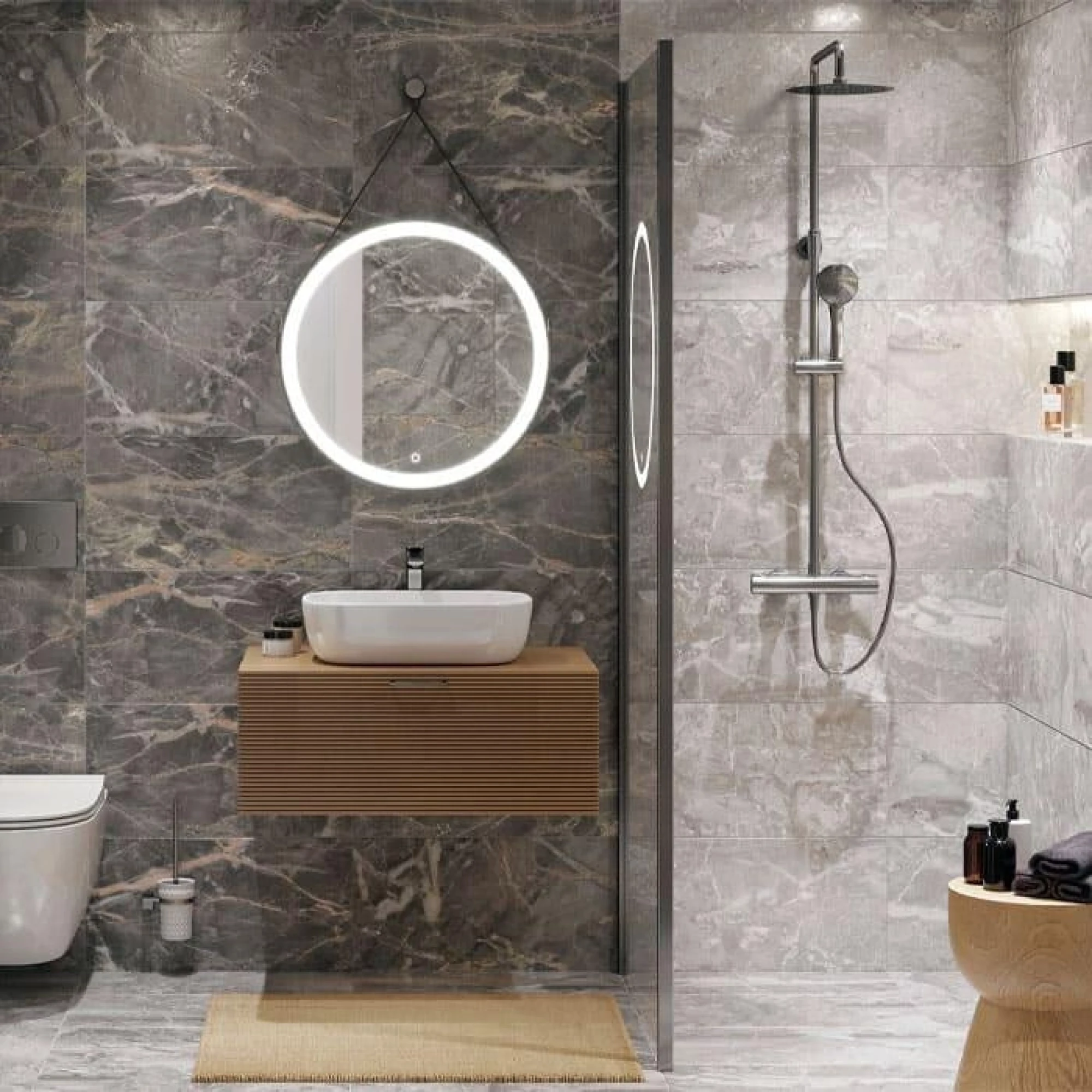 Коллекция керамогранита Wonderstone — это искусная имитация натурального камня в сером и тёмно-сером цветах. Многофейсовый дизайн вносит разнообразие в выкладку, и рисунок не выглядит единообразным. Декорация с рисунком тропических листьев оживляет коллекцию. С её помощью можно расставить акценты или зонировать пространство. Карвинговые чернила с мерцающим эффектом добавляют покрытию натуралистичности. Весь керамогранит коллекции Wonderstone покрыт гранилью, благодарю чему обладает эффектом «антискольжения» и становится более износостойким. Отделочный материал выигрышно смотрится не только в санузле и ванной комнате, но и в гостиной, на кухне, на балконе и в коридоре.