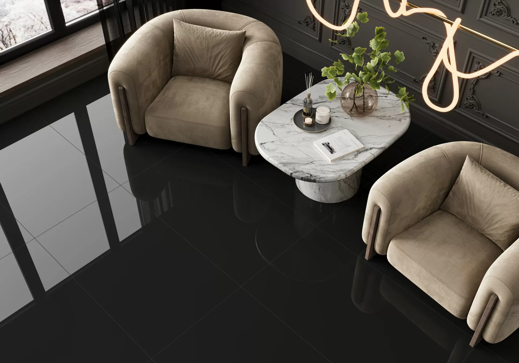 Коллекция Domines состоит из двух артикулов белого и чёрного керамогранита. Супербелый керамогранит — один из сложнейших в производстве, ведь на таком чистом полотне заметны малейшие оттенки. Чёрный однотонный керамогранит также является сложным для производства: получение этого цвета требует большого количества специальных высокопигментированных чернил, а такую глубину чёрного оттенка возможно получить только в суперполированной поверхности. Специально для изготовления этих артикулов на производстве технологи бренда значительно увеличили показатели белизны для Domines Super White и подобрали необходимую формулу суперчёрных чернил для Domines Black. Улучшение формул за счёт дорогостоящих компонентов и специальной глазури позволило создать чистые, насыщенные цвета, которые являются универсальными компаньонами к артикулам наших керамогранитов.